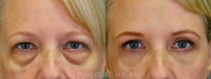 This lovely patient has significant laxity of her upper and lower eyelids as well as bags and circles under her eyes. She had an upper eyelid lift (blepharoplasty). Since she had a significant amount of lower eyelid laxity, an external incision (transcutaneous) approach was used. This is also called extensive or deep plane blepharoplasty, where the excessive loose skin is removed, the fat pads are repositioned, and the muscle and ligaments are tightened ( canthoplasty). Note the smooth lower eyelid/cheek contour achieved with this procedure.