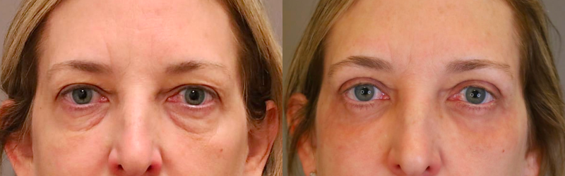 This patient was bothered by heaviness and loose skin of the upper eyelids, difficulty applying makeup, as well as lower eyelid bags and dark circles that created a tired appearance. She underwent a customized upper eyelid blepharoplasty with fat pad repositioning, scarless (transconjunctival) lower eyelid blepharoplasty with fat repositioning , and CO₂ laser skin resurfacing to improve skin texture, tone and reduce fine wrinkles. There’s still some discoloration involving lower eyelids as a result of laser skin resurfacing, which should resolve over the next a few weeks.