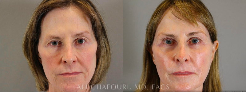 This lovely patient underwent blepharoplasty, fat grafting, or fat transfer to the lower eyelids, cheek, and temples. She also had CO2 laser skin resurfacing with nano fat around her eyes. Natural results were achieved and she was very happy with the outcome. The second photo was taken one week after the procedure.