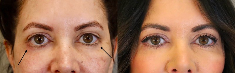 This patient previously underwent bilateral lower eyelid blepharoplasty with fat grafting elsewhere and unfortunately developed lower eyelid retraction. She underwent corrective surgery for the lower eyelid retraction, resulting in significant improvement in eyelid position.
