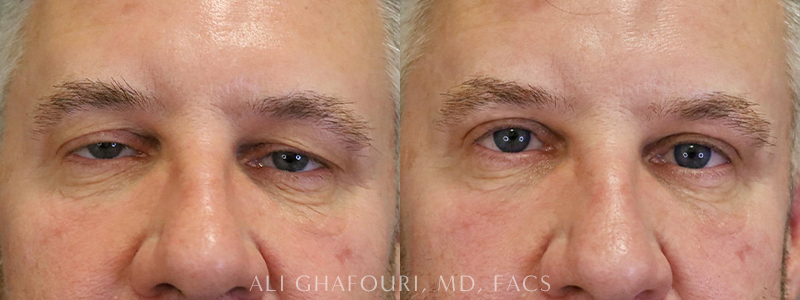 This gentleman was bothered by droopy upper eyelids. Upon examination, he was found to have upper eyelid dermatochalasis—redundant, loose skin of the upper eyelids—and, more importantly, eyelid ptosis, which is weakness of the muscle responsible for opening the eyes. He underwent upper eyelid ptosis repair through tightening of the levator muscle, along with bilateral upper eyelid blepharoplasty to remove the excess skin.